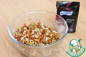 В глубокой миске смешиваю отваренную фасоль, обжаренные лисички и лук, нарезанные оливки. Добавляю соль по вкусу и приправу орегано. Перемешиваю. Начинка готова. -