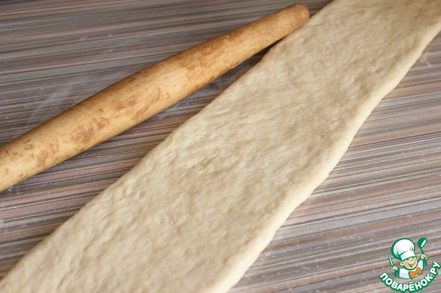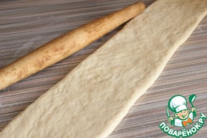 Подошедшее тесто хорошо обминаю. Формирую из него длинную "колбасу". И раскатываю ее так, чтобы длина пласта получилась около 80 см, ширина 10 см, а толщина 1 см. -