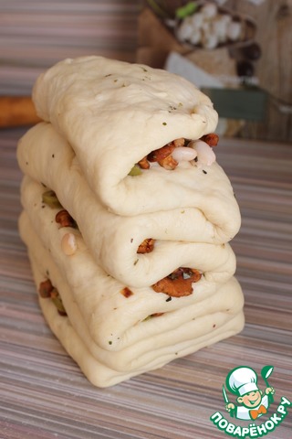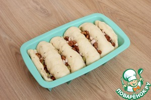 Складываю тесто "гармошкой", прослаивая каждый загиб начинкой (по фото будет понятнее).