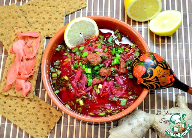 Мясо разобрать на кусочки. Добавить измельченный чеснок, имбирь, зелень, сок лимона или уксус за 10 минут до выключения борща. Всегда лучше дать немного времени настояться борщам и щам!