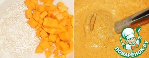 Примерно, через 30 минут начала замешивать тесто. Первым делом измельчила тыкву. Соединила её с овсяной массой, добавила в неё отруби овсяные, сахар 1 ст. л. и пробила блендером.