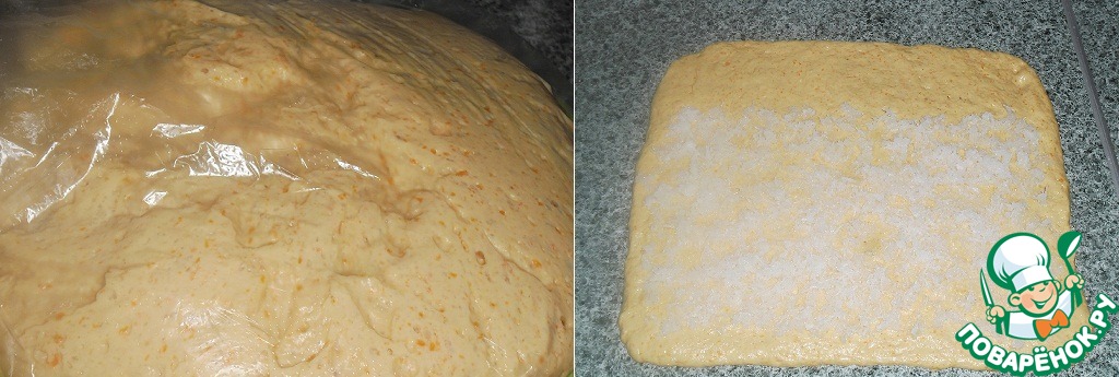 Когда тесто хорошо поднялось, выложить его на стол, смазанный раст. маслом, раскатать в пласт 1,5 - 2 см. выложить на него начинку, распределить по всей поверхности, отступив от той стороны, которая будет внешней.