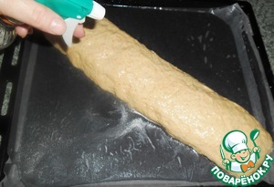 после нового витка теста убирайте пергамент и вновь подкручивайте следующий виток, закончив скручивание рулета, перенесите его на противень.