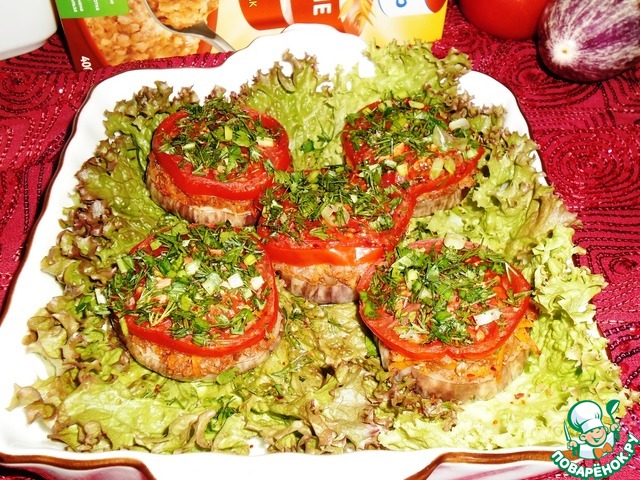 Формирую "шубку" в виде плоской котлетки, укладываю на колечко баклажана, слегка прижимаю. Сверху накрыла помидорами.