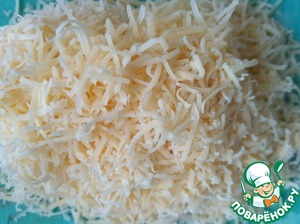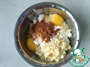 В творог добавить специи, чеснок, яйца. Перемешать.
