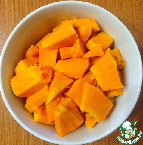 В отдельную кастрюлю налить 1,5 литра воды, довести до кипения. Тыкву почистить, нарезать кусочками, добавить в кастрюлю.
