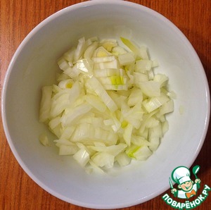 Тем временем почистить лук, нарезать кубиками и обжарить на масле до прозрачности.