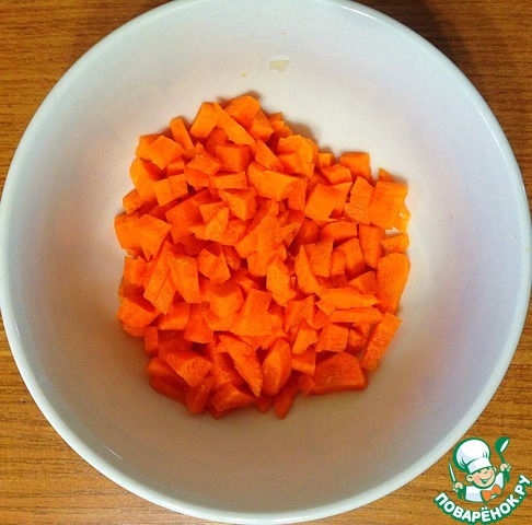 Морковь почистить, нарезать кусочками, добавить к луку и обжарить до полуготовности. Овощи добавить в суп, посолить.
