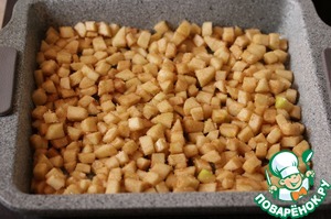 Форму 20х20 см слегка смазать растительным маслом, выложить в нее яблоки, разровнять.