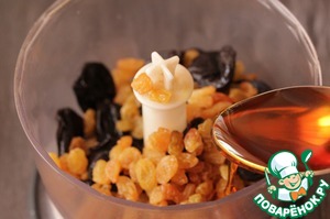 В чашу блендера выложить чернослив и изюм, добавить мед, измельчить.