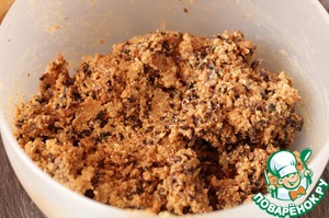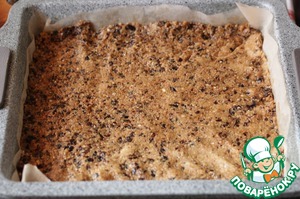 • Форму для выпечки застелить пергаментов, выложить в нее получившуюся массу и разровнять. Удобно делать это руками, слегка смоченными водой.