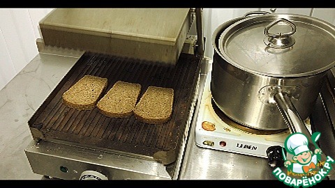 Обжариваем хлеб. Если жарить на сковородке, то нужно обмазать маслом с двух сторон и обжарить до золотистой корочки (примерно 1 минуту).