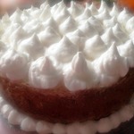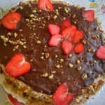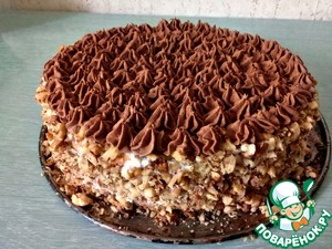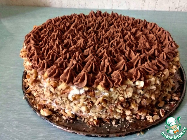 Бока также промазываем творожным кремом и украшаем измельченными орехами. Верх торта украшаем шоколадным кремом.