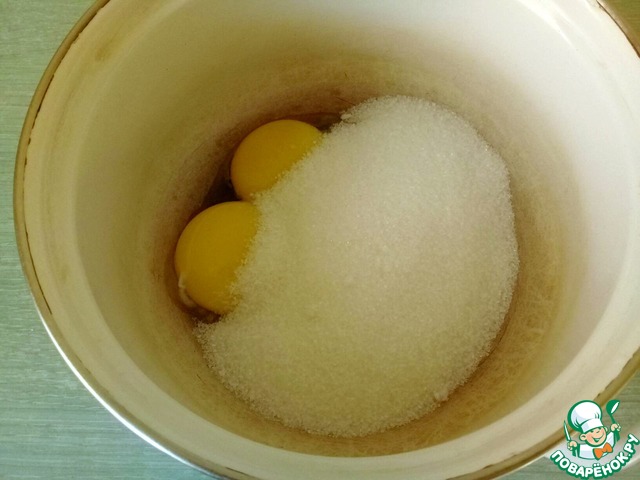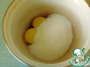 Желтки взбиваем с сахаром до бела.