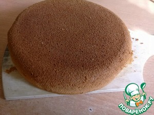 Готовый бисквит остудить и разрезать на 2 части.
