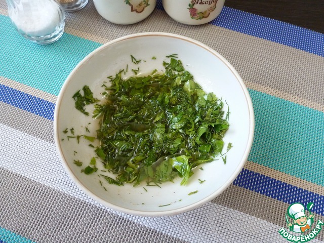 Укроп и петрушку нарезать и добавить в заправку. Отставить в сторону, пусть настаивается.
