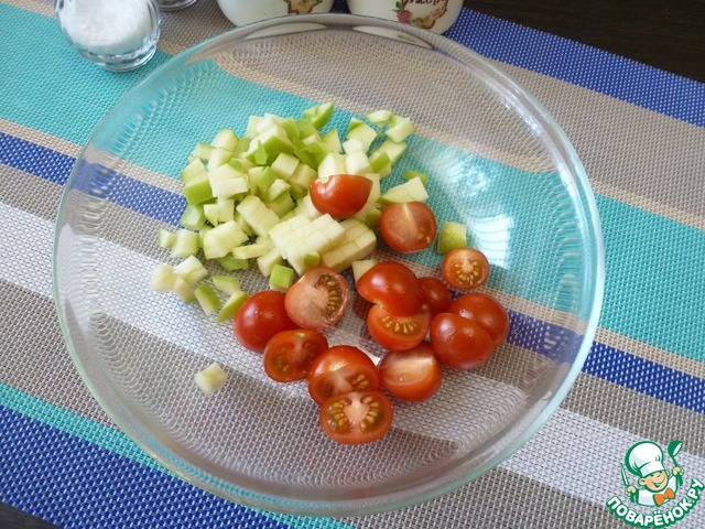 Половину яблока нарезать мелким кубиком (примерно с чечевицу), помидоры черри разрезать пополам. Сложить всё в миску.