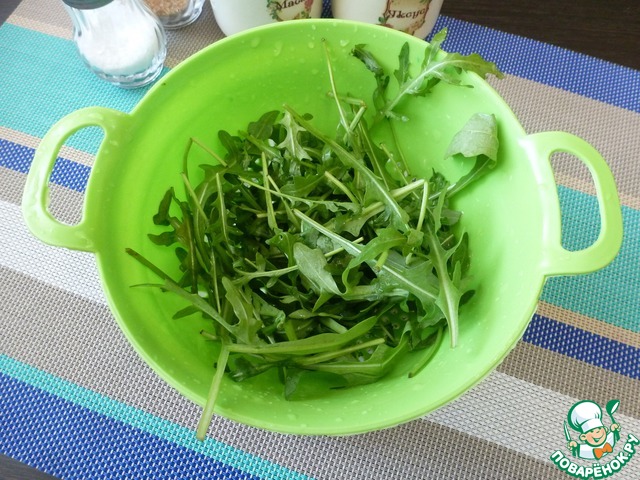 Пучок рукколы промоем холодной водой, стряхнем воду.