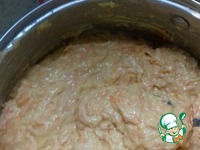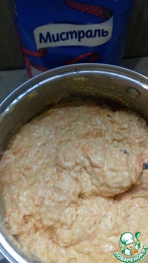 Мука + крахмал +разрыхлитель - перемешать. Добавить в морковную смесь. Количество муки зависит от сочности морковки. Должно получится довольно густое тесто, которое можно мешать ложкой. |