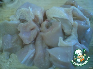 Нарезать куриное филе на небольшие куски. Добавить соль, перец и перемешать.