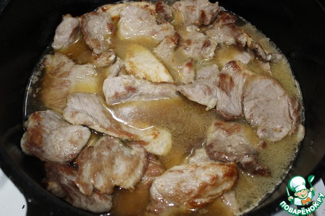 Мясо вернуть в сковородку и залить сухим вином и 400 мл горячего бульона. Мясо должно быть чуть прикрыто жидкостью. Если бульон несоленый, то посолить 0,5 чайной ложкой соли.