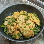 Выкладываем на сковородку полностью размороженную фасоль и перемешиваем минут 5.
