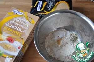 Смешиваем муку, измельчённые овсяные хлопья, сахар (у меня коричневый демерара от "Мистраль"), сухую петрушку (любую сушёную зелень по желанию), разрыхлитель, хлопья перца чили. Я люблю везде острое, если делаете детям, можете не класть. Все перемешиваем.