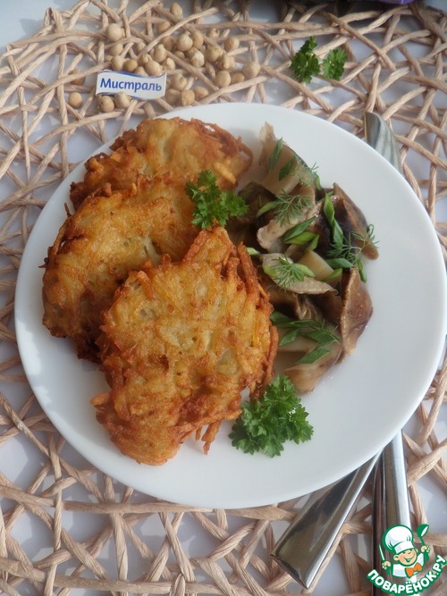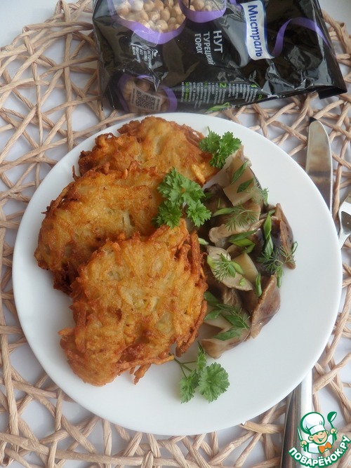В разогретую сковороду наливаем растительное масло. С помощью ложки выкладываем в сковороду картофельно-нутовую массу в виде небольших лепешек.