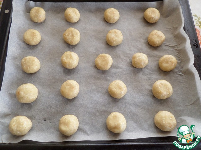 От теста отщипываем небольшой кусочек (20-30 гр) и придаем форму шара, затем шар слегка расплющиваем. Выкладываем шарики-лепешечки на противень, застеленный пергаментом.
