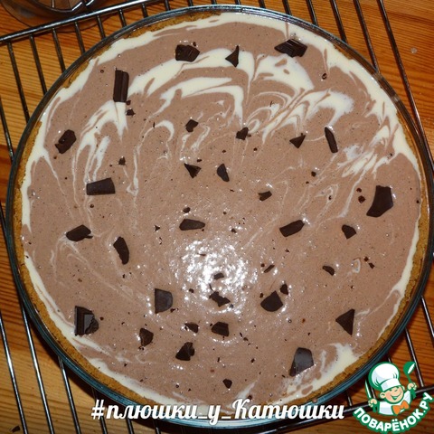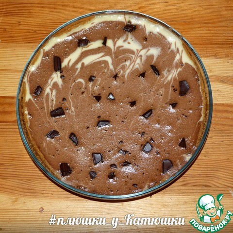 Я делала мраморный чизкейк с добавлением какао и горького шоколада. Часть творожной массы я смешала с какао, вылила на белую массу, немного перемешала вилкой и украсила кусочками горького шоколада.