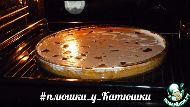 Ставим форму в высокий противень и заливаем горячей водой до половины высоты формы. У кого такого противня нет - ставим форму на решётку, а на уровень ниже обычный противень с горячей водой. Оставляем наше чудо выпекаться минут 60, а потом можно градусов на 10 поднять температуру и ещё подержать 15 минут. Во время и сразу после выпекания духовку не открывайте!