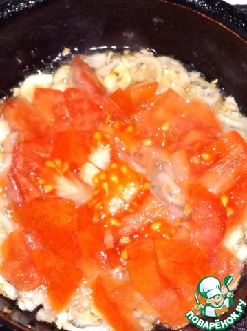 • Затем в сковороду добавить нарезанный кубиками помидор. Жарить около 5 минут, посолить.