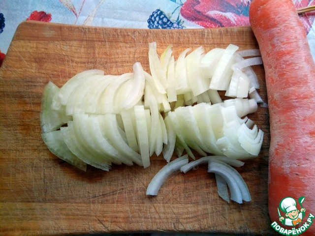 А пока рис закипает и варится, параллельно займемся приготовлением овощей. Первым чистим лук, режем его и обжариваем на растительном масле.