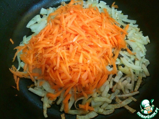 Морковь чистим, натираем на крупной терке и отправляем в сковороду к луку.