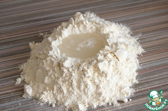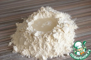 Муку насыпаю на рабочую поверхность, добавляю соль, слегка перемешиваю. Делаю лунку в середине и постепенно начинаю в нее вливать воду, при этом замешивая тесто. -