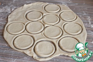 Раскатываю каждую часть теста в пласт. Затем стаканом вырезаю кружки теста для вареников (у меня диаметр стакана 6,5 см). -