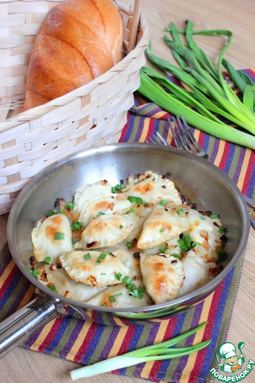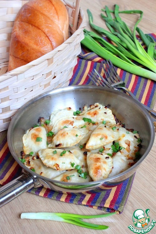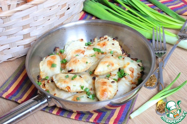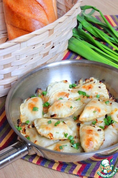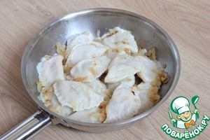 Готовые вареники перекладываю на сковороду, смазанную растительным маслом. Посыпаю сверху обжаренным луком.