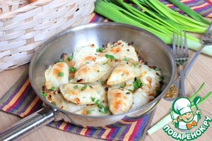 Запечённые вареники с чечевицей и соленым огурцом посыпаю зеленым луком и подаю к столу прям в сковороде.