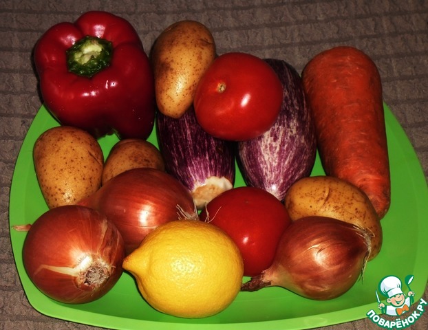 перец, баклажаны и помидоры - крупными дольками;