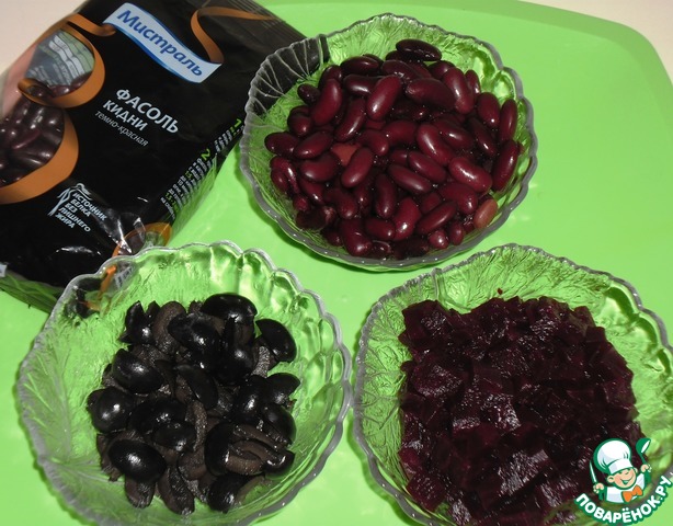 У меня получилось по стакану фасоли и свеклы, а маслин 2/3 стакана. -