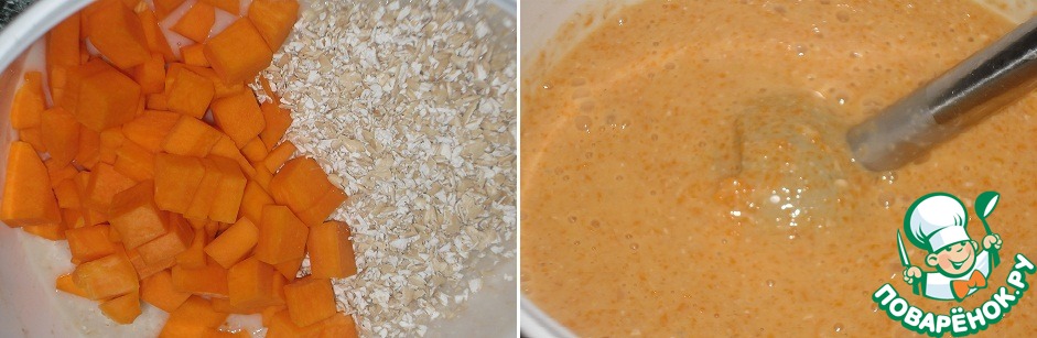 • Через 1 час добавить тыкву кусочками, измельчить блендером.