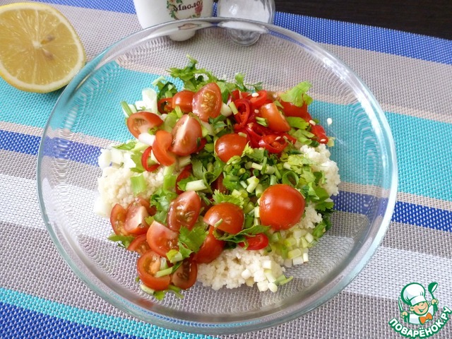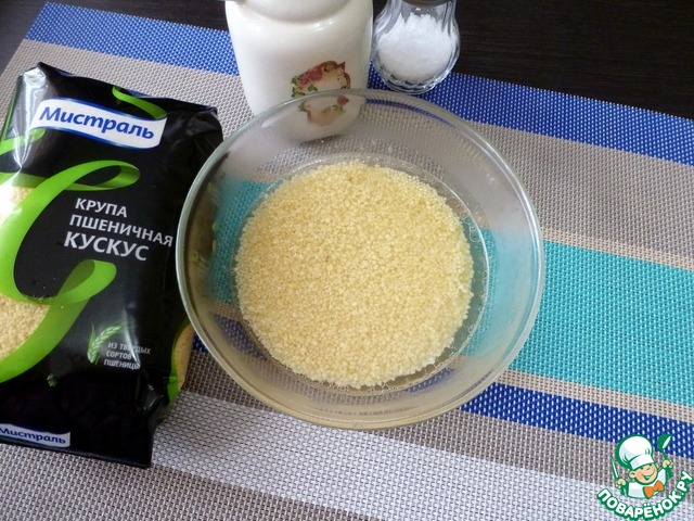 Кускус залить горячей водой, ориентируясь инструкции на упаковке. Добавить лимонного сока, оливкового масла, немного посолить и дать набухнуть минут 10-15.