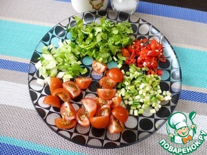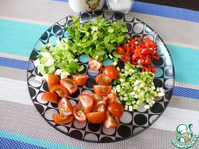 Помидоры черри нарезать четвертинками. Черемшу, зелёный лук, кинзу и чили мелко нарезать.