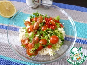 Кускус разворошить вилкой, добавить нарезанную зелень и черри.