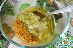 Маринованный огурец и чеснок натереть на мелкой терке. Выложить в пиалу, добавить горчицу и ароматное подсолнечное масло. Смешать.