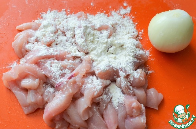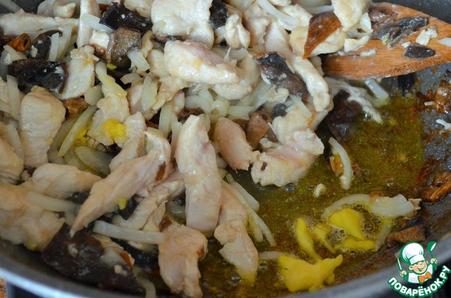 На растительном масле обжарить грудку, на сильном огне, перемешивая.