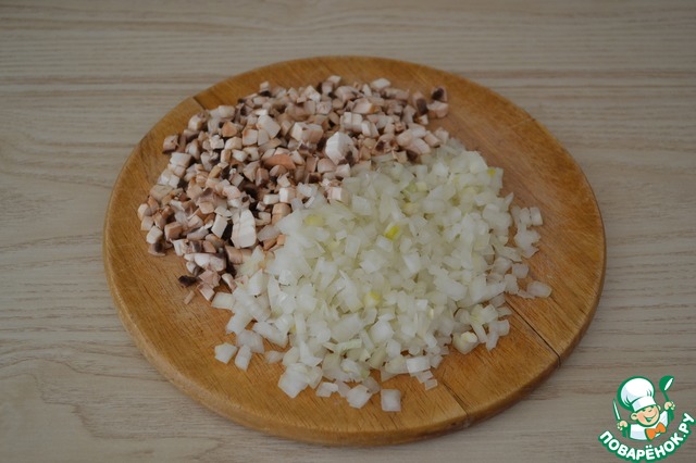 Готовим начинку: лук мелко шинкуем, грибы режем мелким кубиком. Обжариваем до готовности с 2-мя столовыми ложками растительного масла.