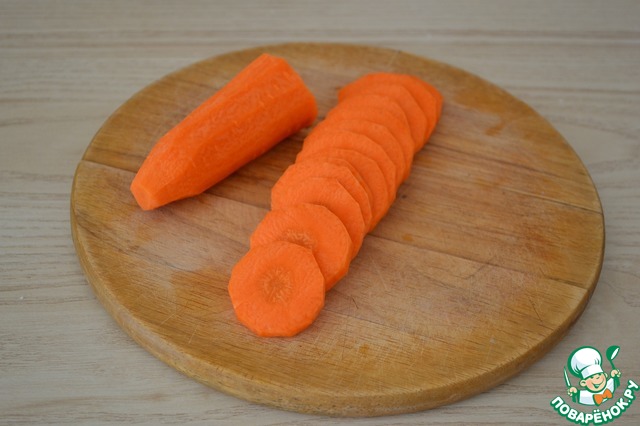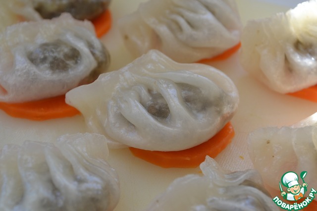 Когда тесто остынет раскатываем его толщиной около 2 мм. Вырезаем круги и лепим пельмени. Каждую пельмешку кладем на кусочек моркови (чтобы не прилипли). Готовим на пару около 10 минут.