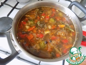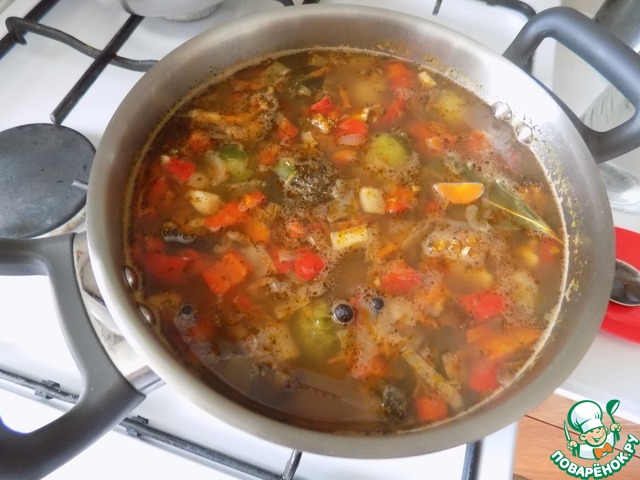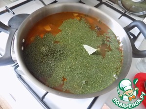 • Добавляем сухой укроп и петрушку, лавровый лист, душистый перец, 1 ст л оливкового масла. Варим ещё с минуту.