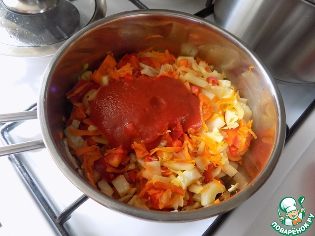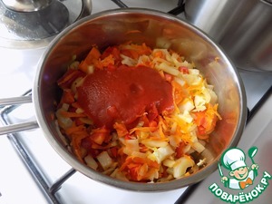 • Через минуту добавляем протёртые томаты. Томим все овощи до полной готовности. Если нет протёртых томатов, то берём обычные.